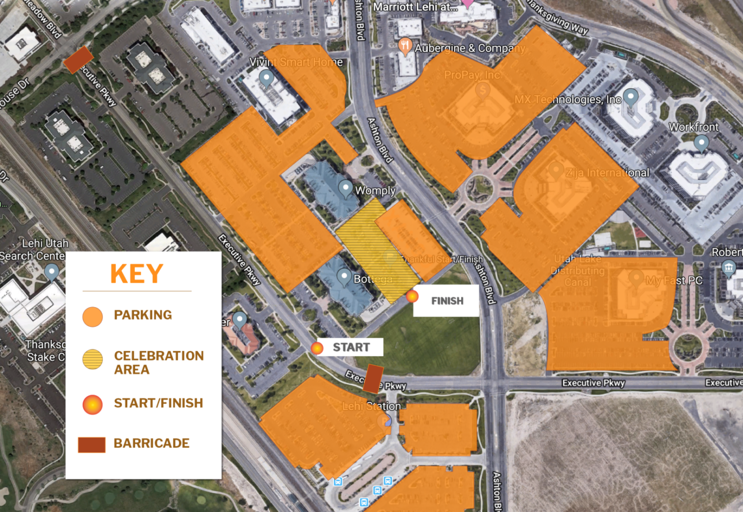 The finish line is at Thanksgiving Point (behind the UVU building) at 2912 Executive Pkwy, Lehi, Utah.