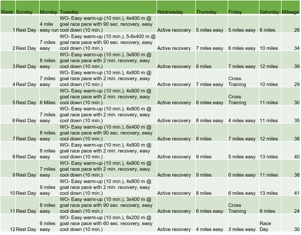 • Workouts: The workouts are all basic workouts that everyone should be able to figure out with the instructions below, If you need to change them for more advanced workouts that is fine, but try to keep them a similar intensity as the planned workout, as the intensity of the workouts is balanced with the mileage.