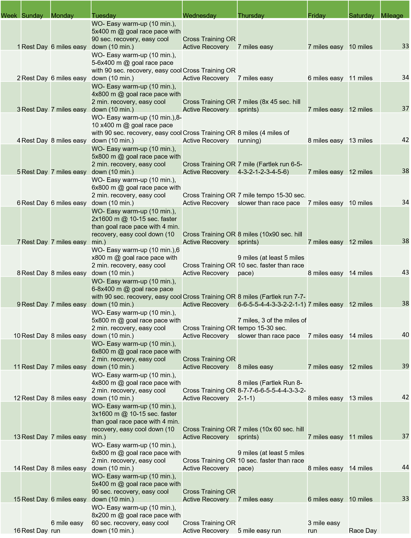 - Workouts: The workouts are all basic workouts that everyone should be able to figure out with the instructions below, If you need to change them for more advanced workouts that is fine, but try to keep them a similar intensity as the planned workout, as the intensity of the workouts is balanced with the mileage.