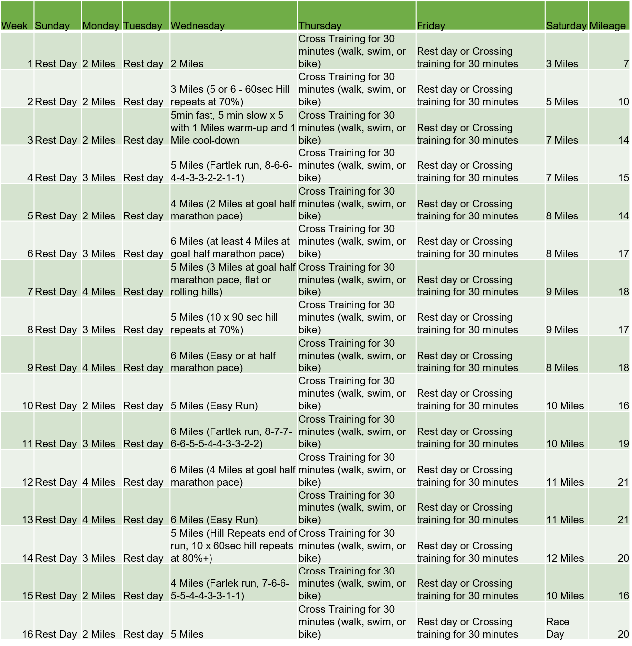 - Workouts: The workouts are all basic workouts that everyone should be able to figure out with the instructions below, If you need to change them for more advanced workouts that is fine, but try to keep them a similar intensity as the planned workout, as the intensity of the workouts is balanced with the mileage.
