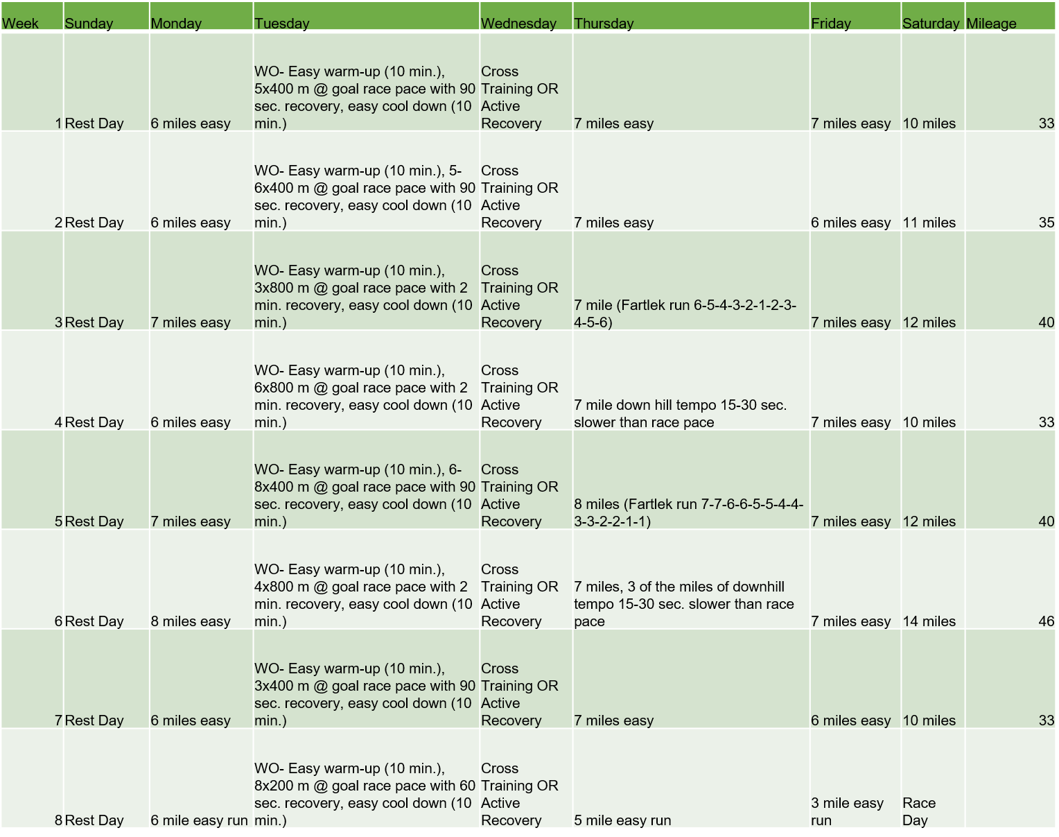 • Workouts: The workouts are all basic workouts that everyone should be able to figure out with the instructions below, If you need to change them for more advanced workouts that is fine, but try to keep them a similar intensity as the planned workout, as the intensity of the workouts is balanced with the mileage.